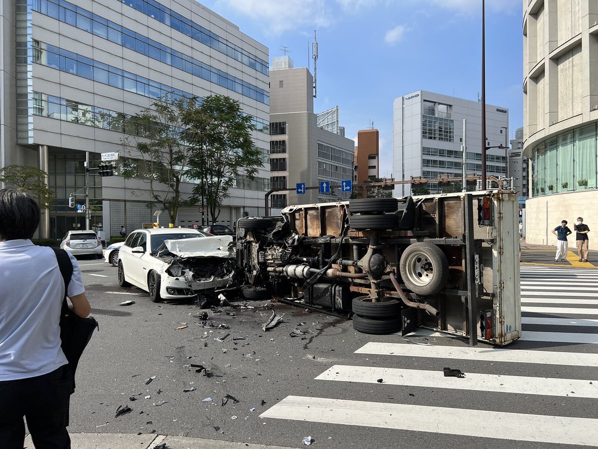 トラック右折事故で横転し軽傷2人
