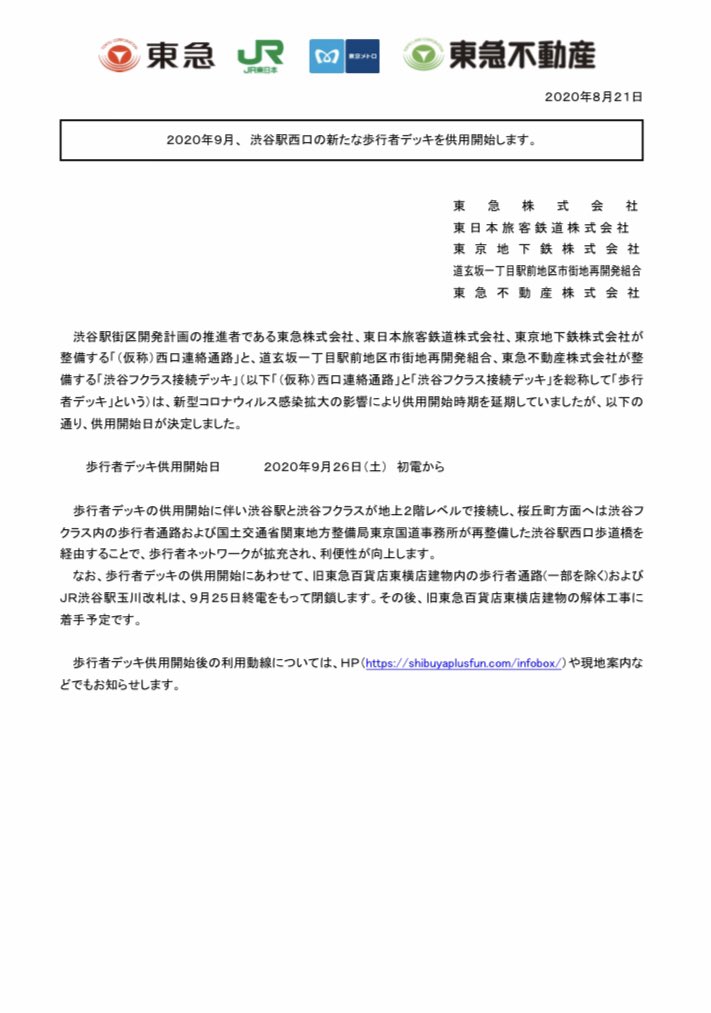 | 2020 年 8 月 21 日 | 2020 年 9 月、 渋谷駅西口の新たな歩行者デッキを供用開始します。 | 東急株式会社 東日本旅客鉄道株式会社 東京地下鉄株式会社 道玄坂一丁目駅前地区市街地再開発組合 東急不動産株式会社 |