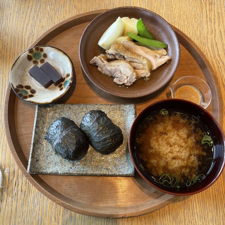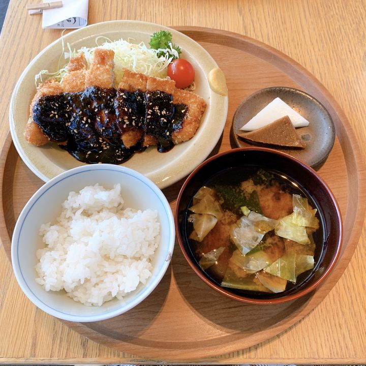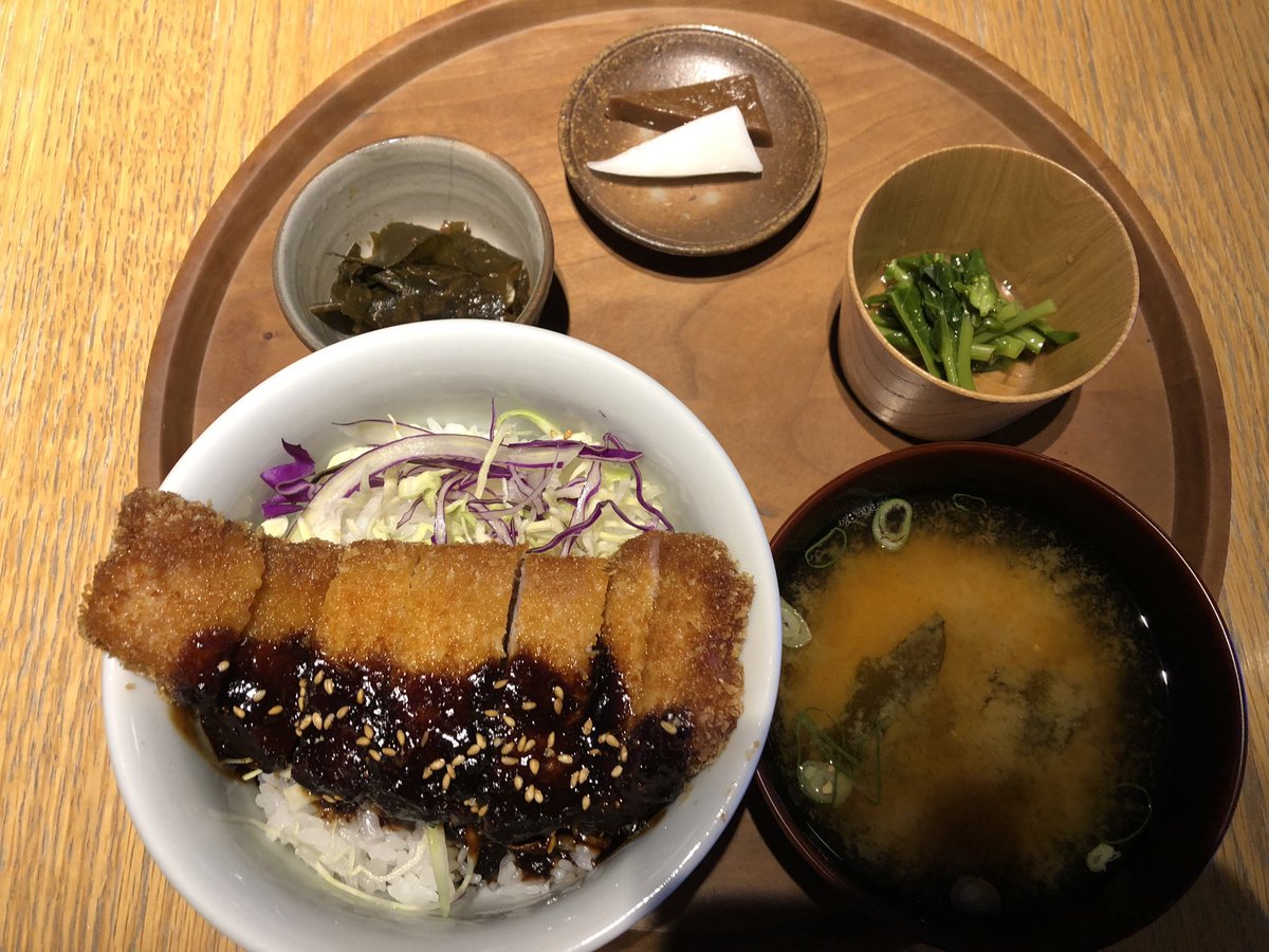 八丁味噌と三河みりんの味噌ダレのカツ丼に、昆布の酢味噌和え、菜の花のお浸しと味噌汁、デザートに生せんべい(お餅に似た生菓子)が付いて大満足😋。 pic.twitter.com/XRpTU5eeQS