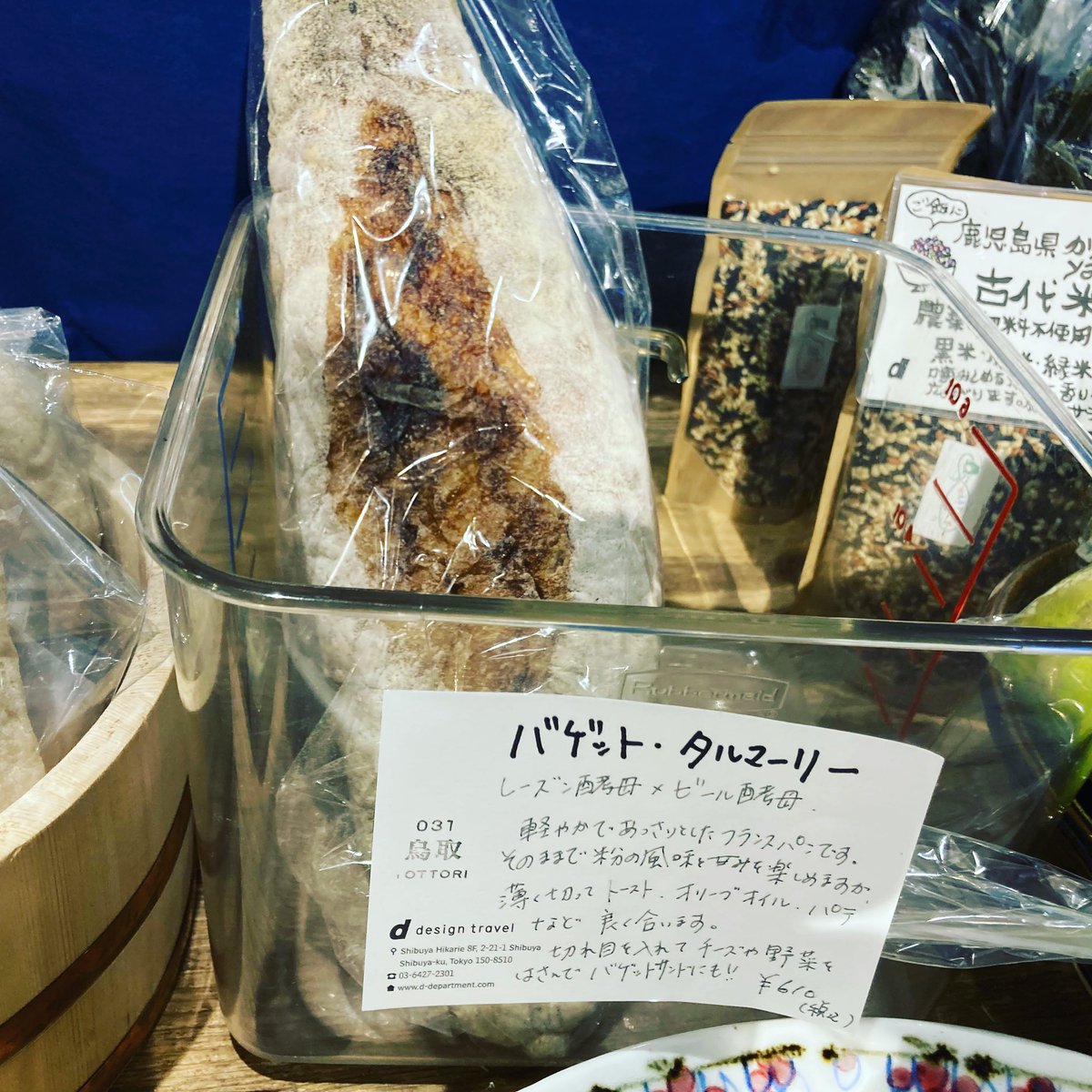 教えていただき、鳥取タルマーリーのバゲットを。毎月一度、入荷してくるそうです。渋谷○○書店がある渋谷ヒカリエ8階のd47食堂の店頭に並んでいました。 pic.twitter.com/aypukKUwei 2021-10-17 13:29:00
