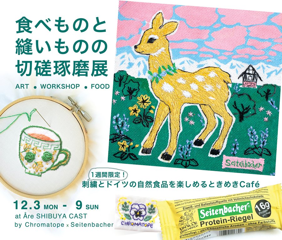 刺繍とドイツの自然食品を楽しめる Seietnbacher×Chromatopeのコラボカフェを、「食べものと縫いものの切磋琢磨展」と題し、渋谷キャストのカフェÅreで1週間限定でオープンします。12/3-12/9 の間、作品制作のプロセスを体験できるワークショップもやります。予約は: