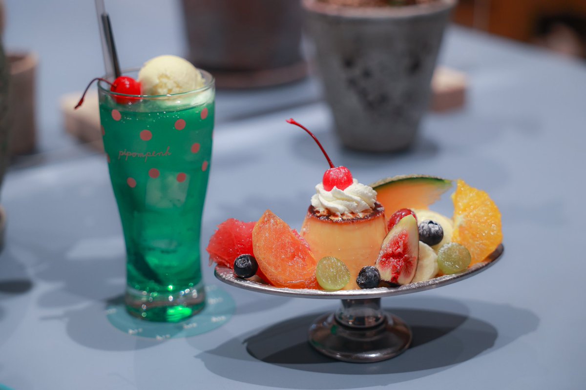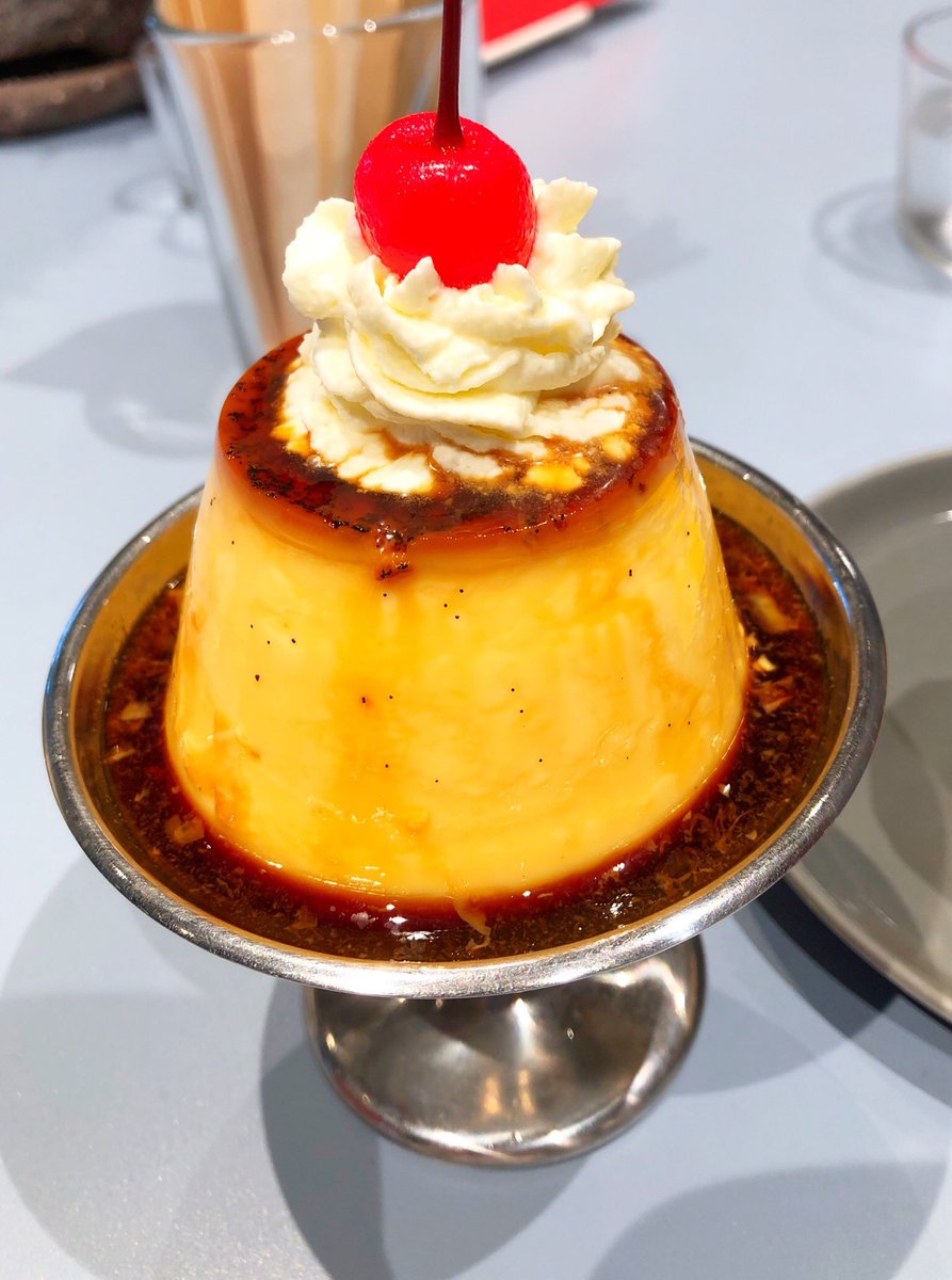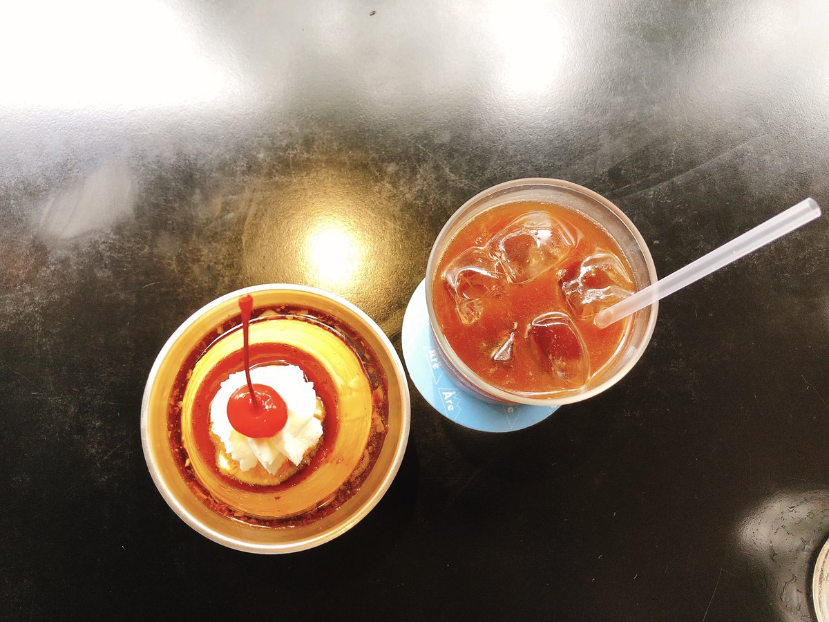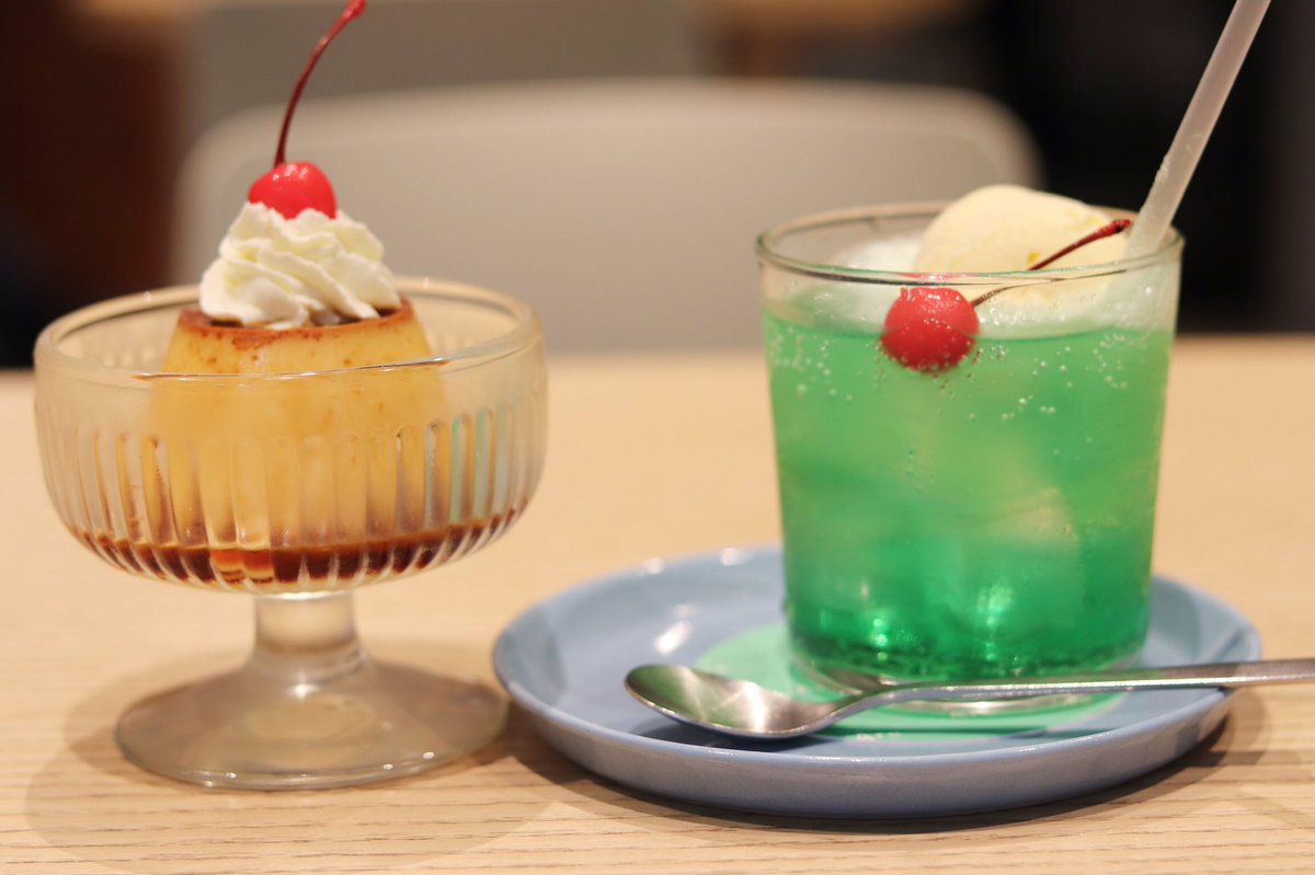 やわらかめ、甘めなプリン。クリームソーダはシロップを割っているのか飲んだことのない味わい。プリンの上に乗ってるクリームが激ウマ。両方すごくおいしかった(*´﹃`*)大満足♩ pic.twitter.com/u9ymydu8N2