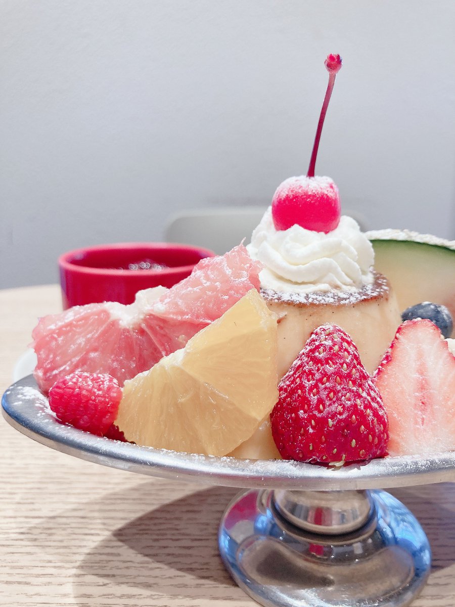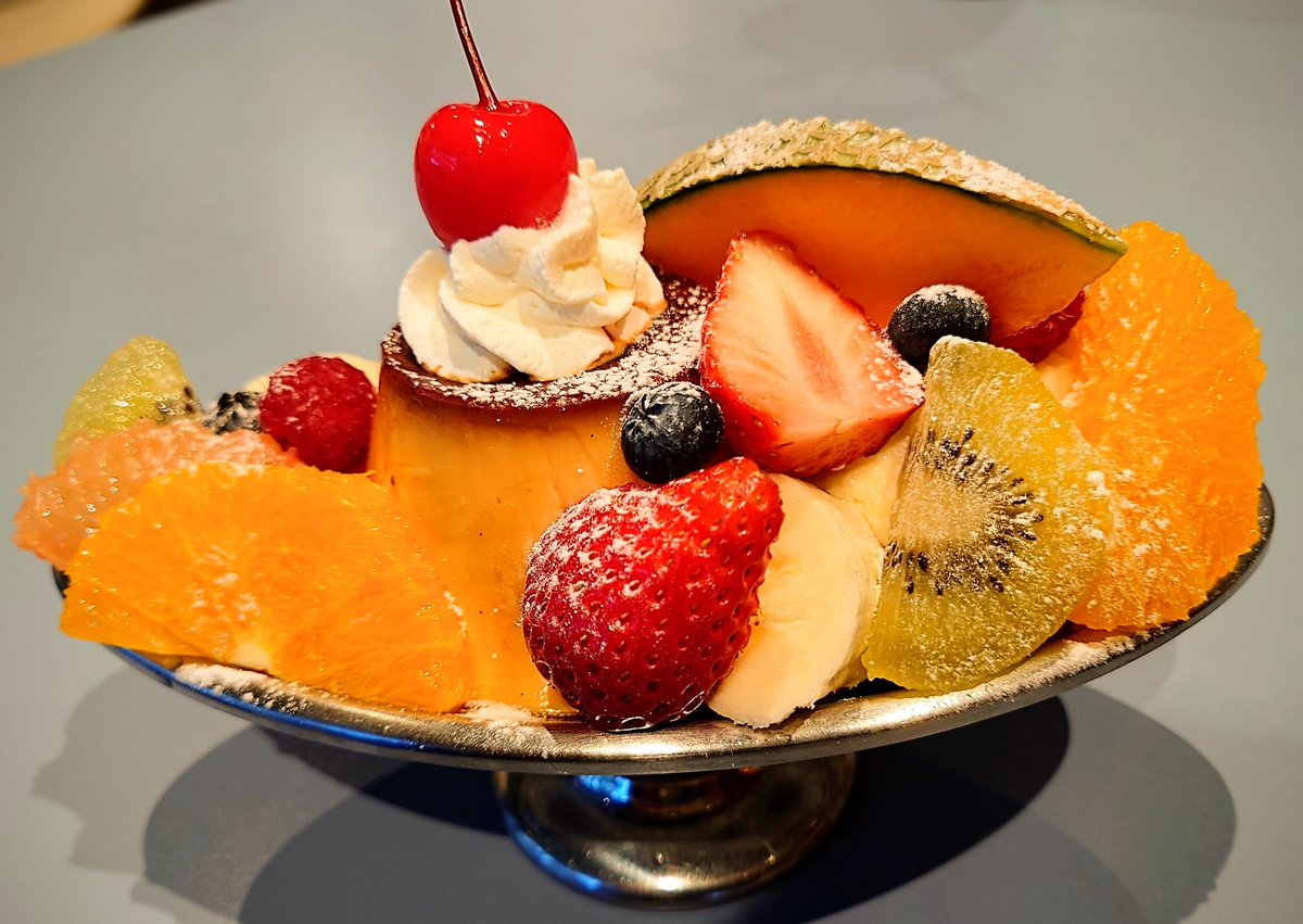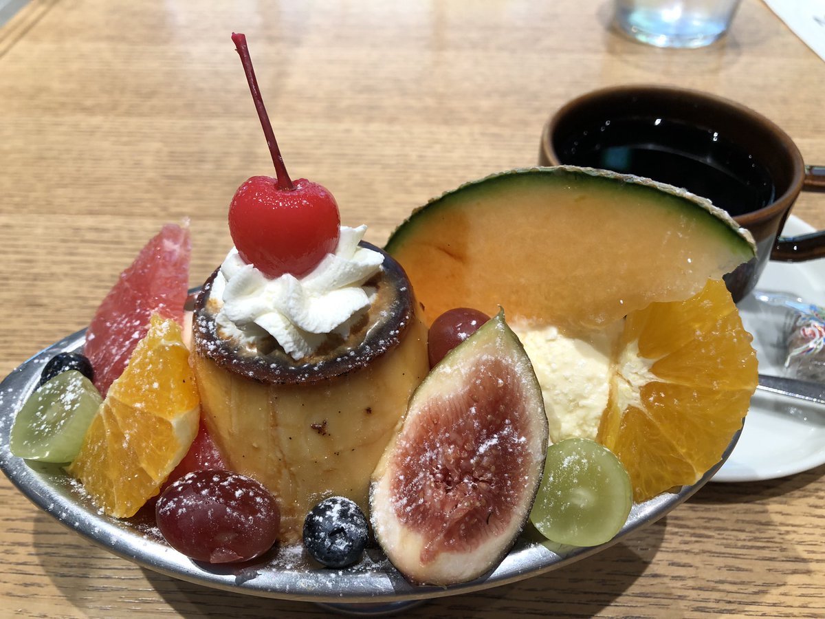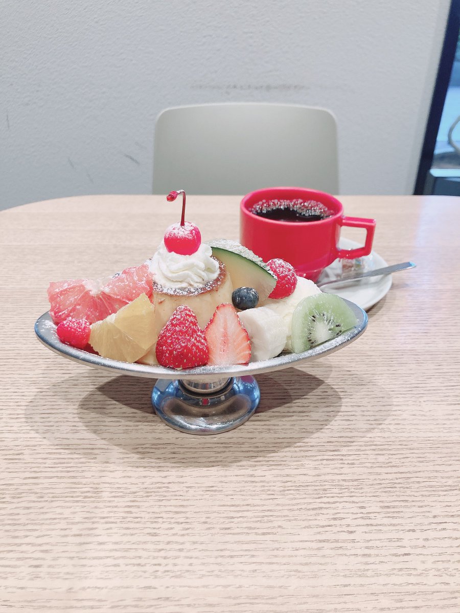 少し高めのプリンアラモード頼んだけど、子供の時に食べて以来だからこんな綺麗なアラモード初めてかも😋