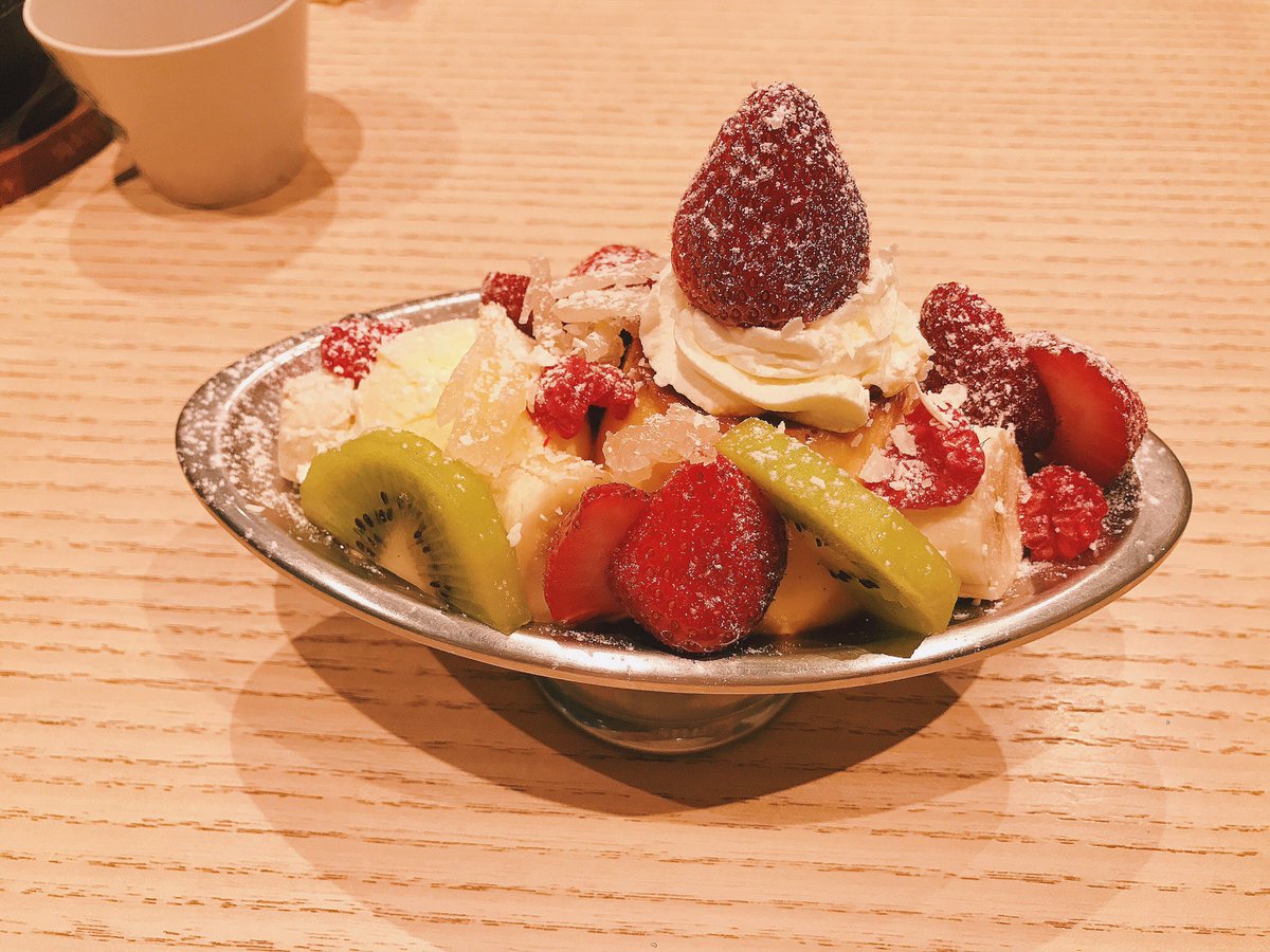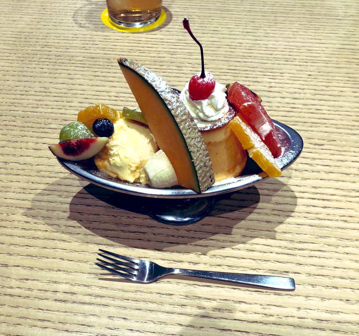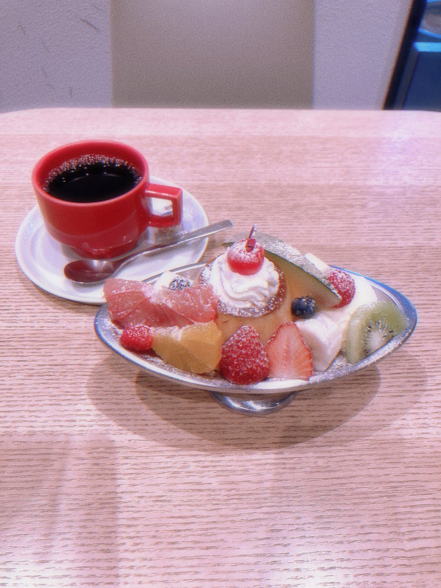 少し高めのプリンアラモード頼んだけど、子供の時に食べて以来だからこんな綺麗なアラモード初めてかも😋