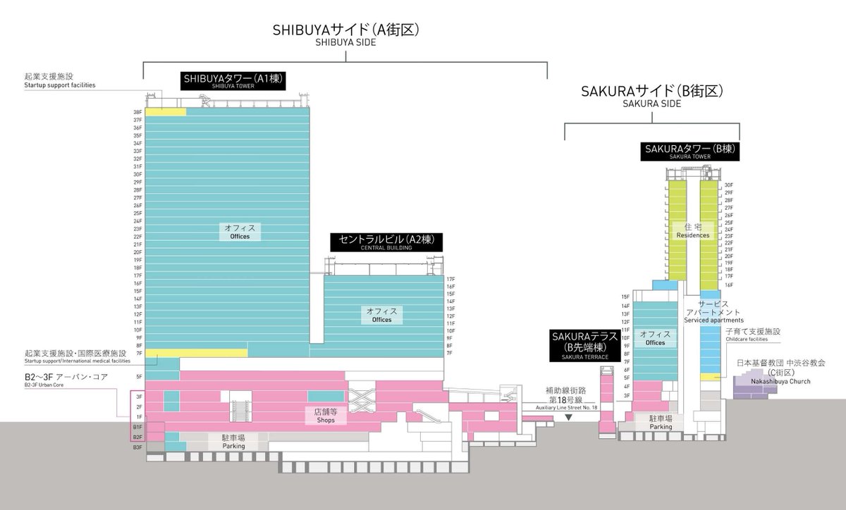 施設名称に合わせて、A 街区の名称を「SHIBUYA サイド」、B 街区の名称を「SAKURA サイド」に決定しました。また、「SHIBUYA サイド」に建設中の A1 棟は「SHIBUYA タワー」、A2 棟は「セントラルビル」、「SAKURAサイド」に建設中の B 棟は「SAKURA タワー」、そして B 先端棟は「SAKURA テラス」と名付けました。