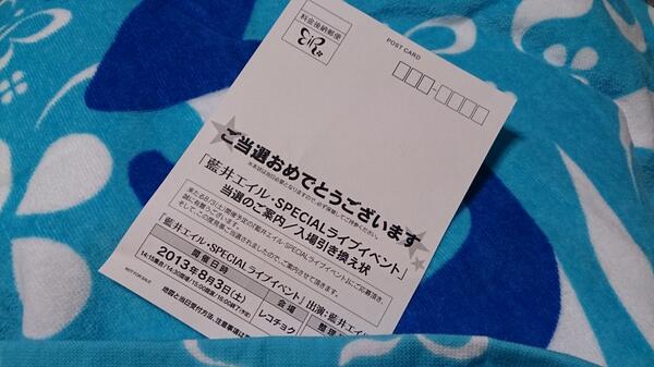 藍井エイルスペシャルライブ終了しました!!めっちゃ近くてビックリしたぁ(/≧◇≦\)トークにスペシャルライブ楽しかったです(*≧∀≦*)エイルさんマジ綺麗☆ pic.twitter.com/Q11KQlRrE5 2013-08-03 16:24:00